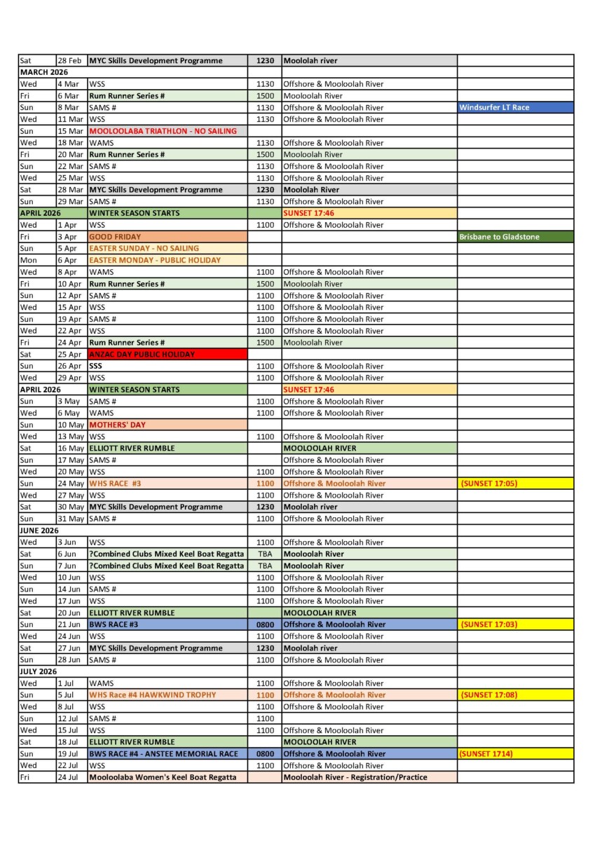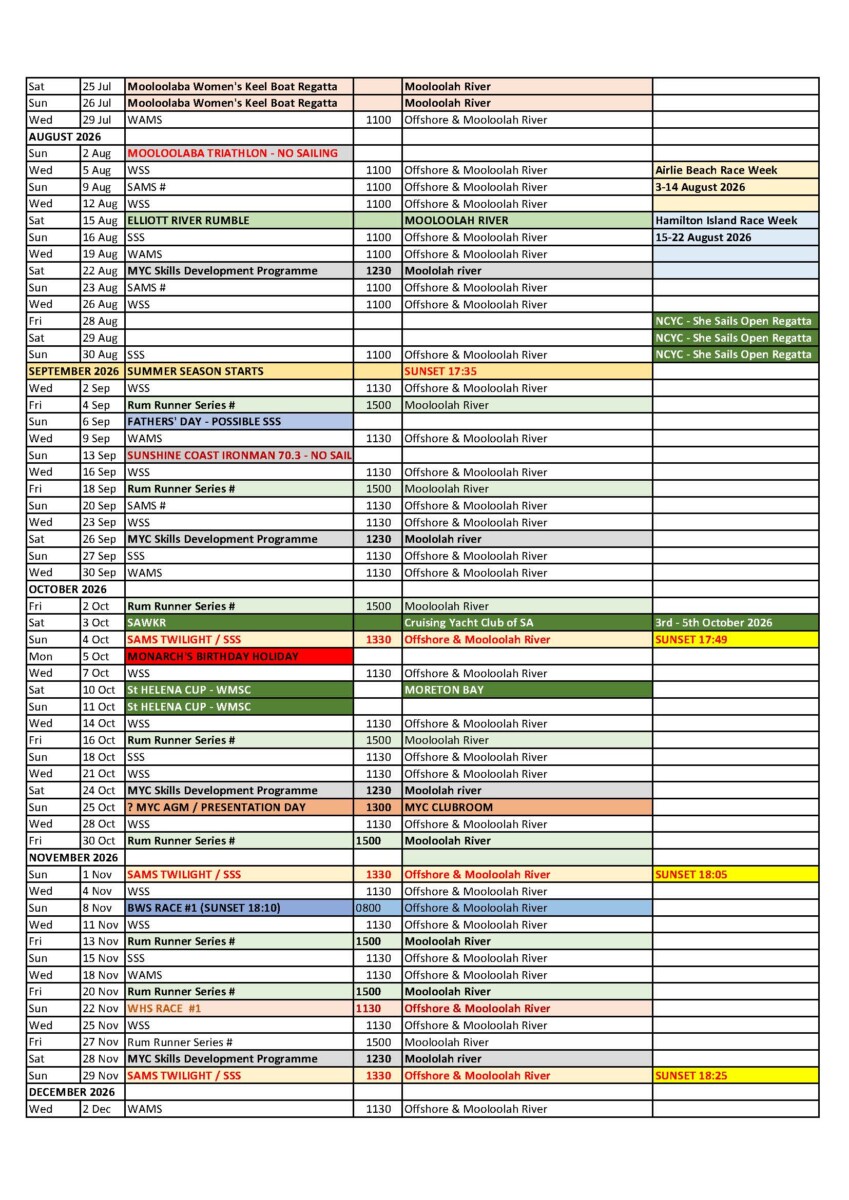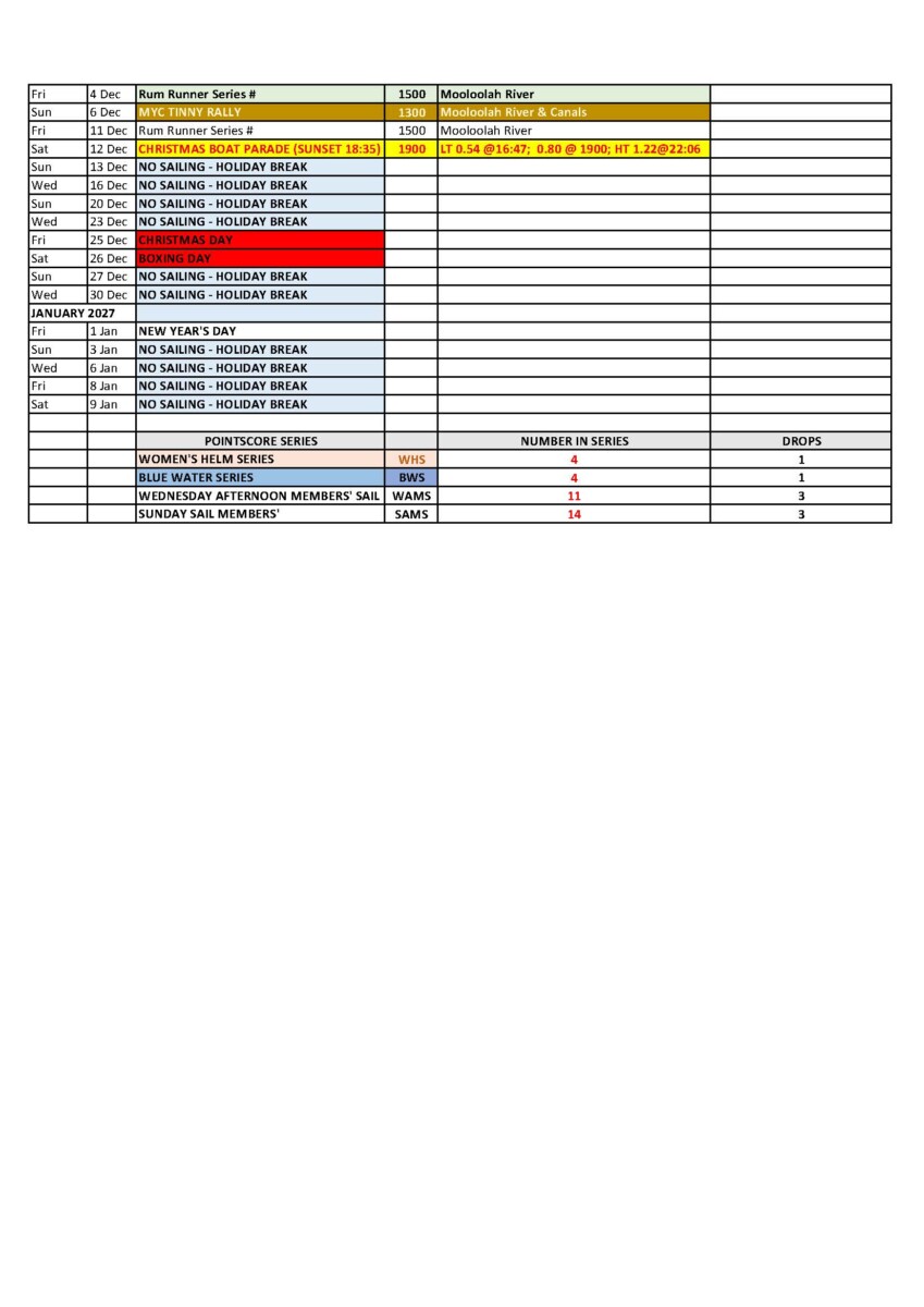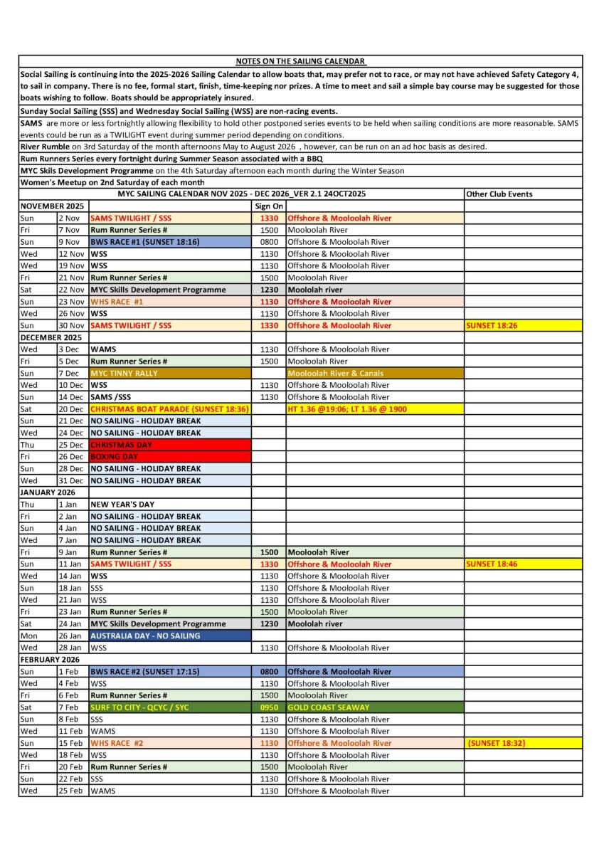 or click here for a printable version of the Sailing and Events Calendar 2025/2026 v2.0 Published 24 October 25